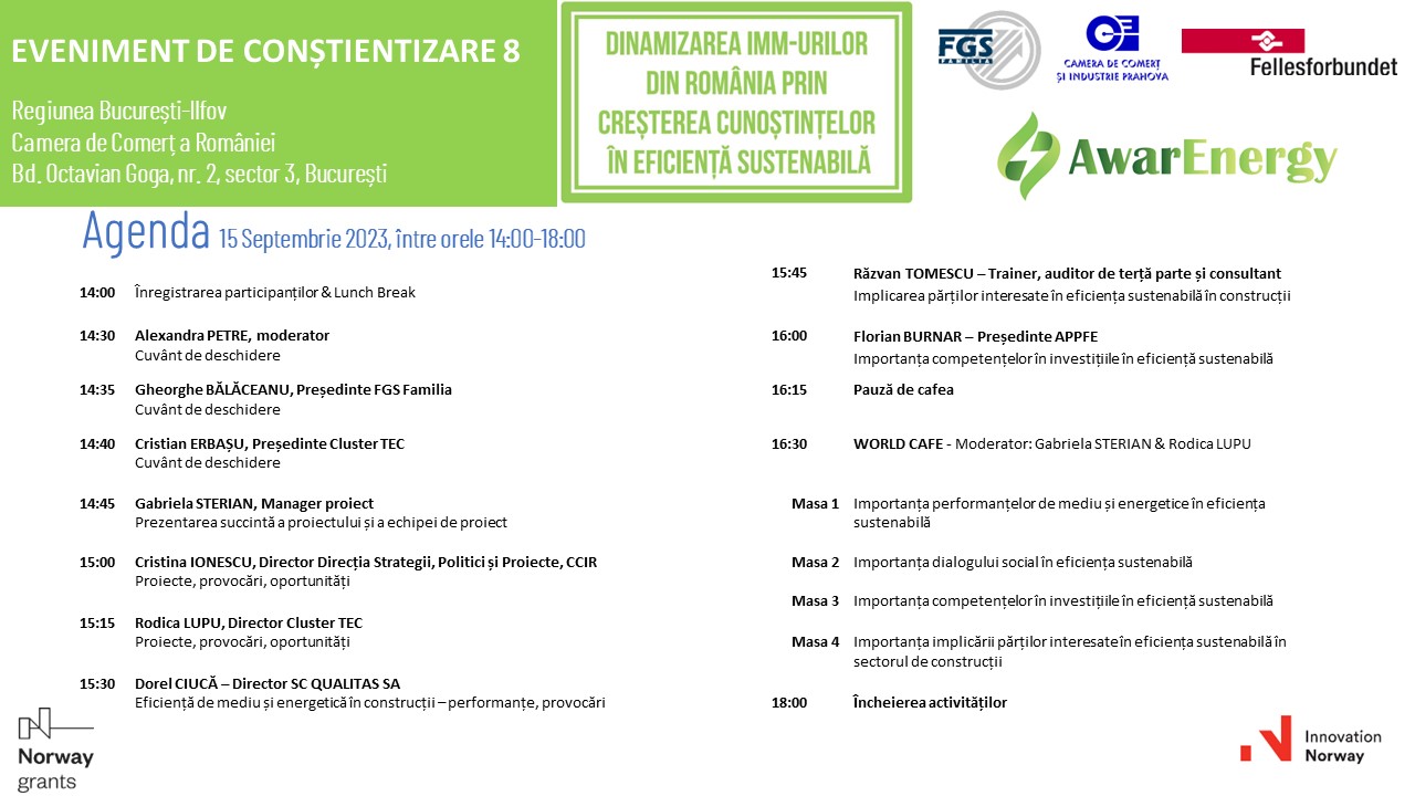 Avem deosebita plăcere să vă invităm să participați la cel de-al optulea eveniment ce are drept obiectiv creșterea conștientizării în domeniul energiei regenerabile, eficienței și securității energetice, realizat în cadrul proiectului „Powering Romanian SMEs to Increased Knowledge in Sustainable Efficiency/Dinamizarea IMM-urilor din România, prin creșterea cunoștințelor în eficiență sustenabilă”, ID 2022/346631, finanțat cu sprijinul granturilor acordate prin mecanismul financiar norvegian 2014-2021 în cadrul „Programului de Energie din România”.